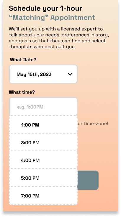 I decided to revamp my original scheduling UX due to the nature of how date and time would be limited by the therapist themselves. Therefore it made sense to reduce the number of clicks by displaying time buttons rather than a drop down filter. This would better convey to the user how many limited options there are.