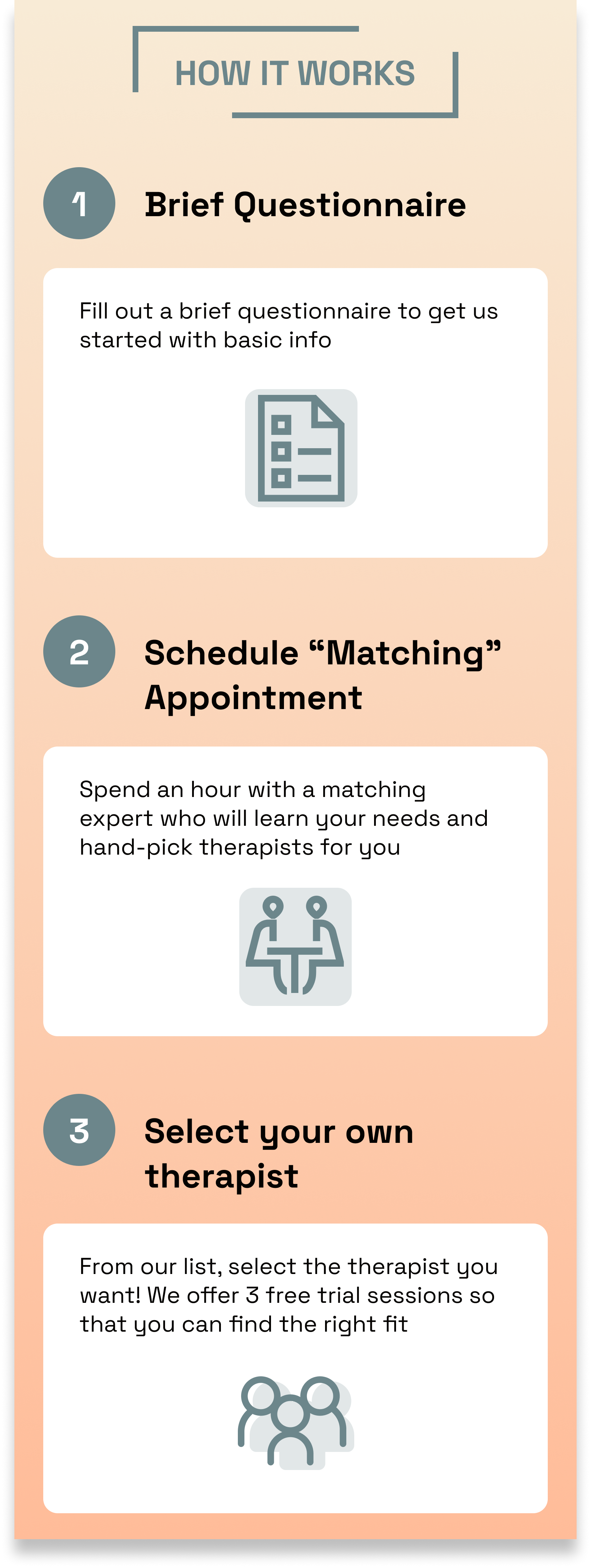 My plan was to improve the user experience by shortening questionnaires to easy questions, allowing users to select their own therapists, granting 3 free trial sessions before paying and introducing a “Matching” Appointment, where the user will meet with a licensed expert to discuss needs, preferences, history, and goals, so they can find the best therapists suited for the user to choose from.